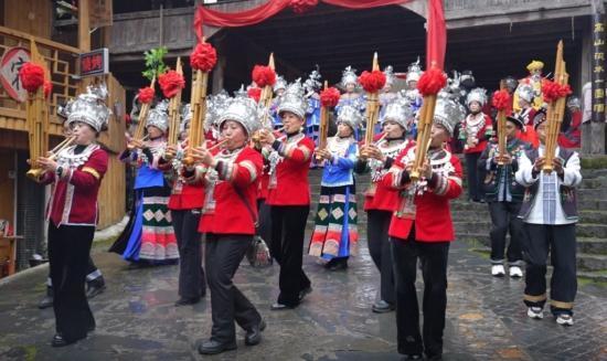 朝晨的上堡侗寨霏霏缭绕,青石板路波折通向寨门。身着盛装的侗族密斯分列两侧,手抓羽觞唱起迎客歌;十余位芦笙队员抬头伫立,竹质笙管在曙光中醒目,雄健泛动的芦笙声穿越村寨,为远谈而来的客东谈主奉上最强烈的迎接。旅客们接过盛满糯米酒的羽觞,一饮而尽,脸上飘溢着藏不住的喜悦笑貌。