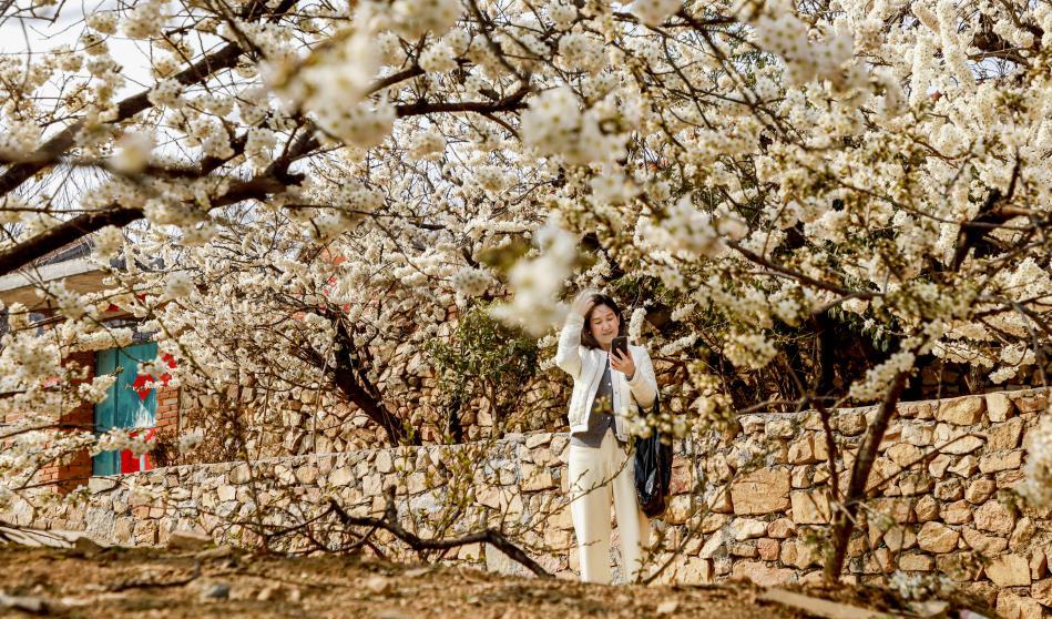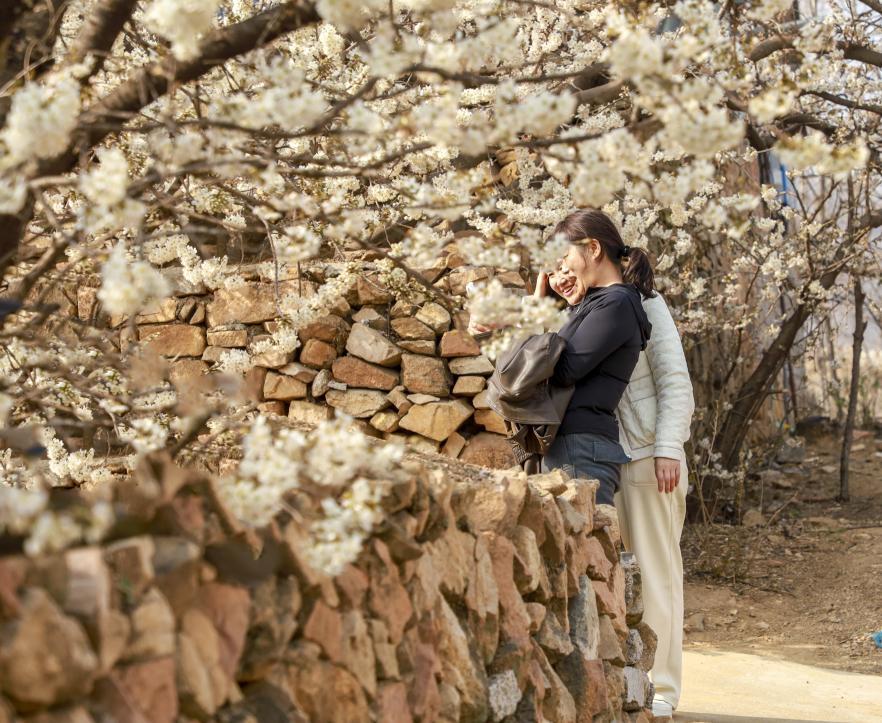 石墙畔,两东谈主倚在春影里,指尖划着刚拍下的花景。厉新昌 摄