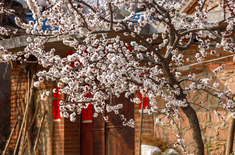 红砖木门衬着白樱,花枝裹着红联的暖意。厉新昌 摄