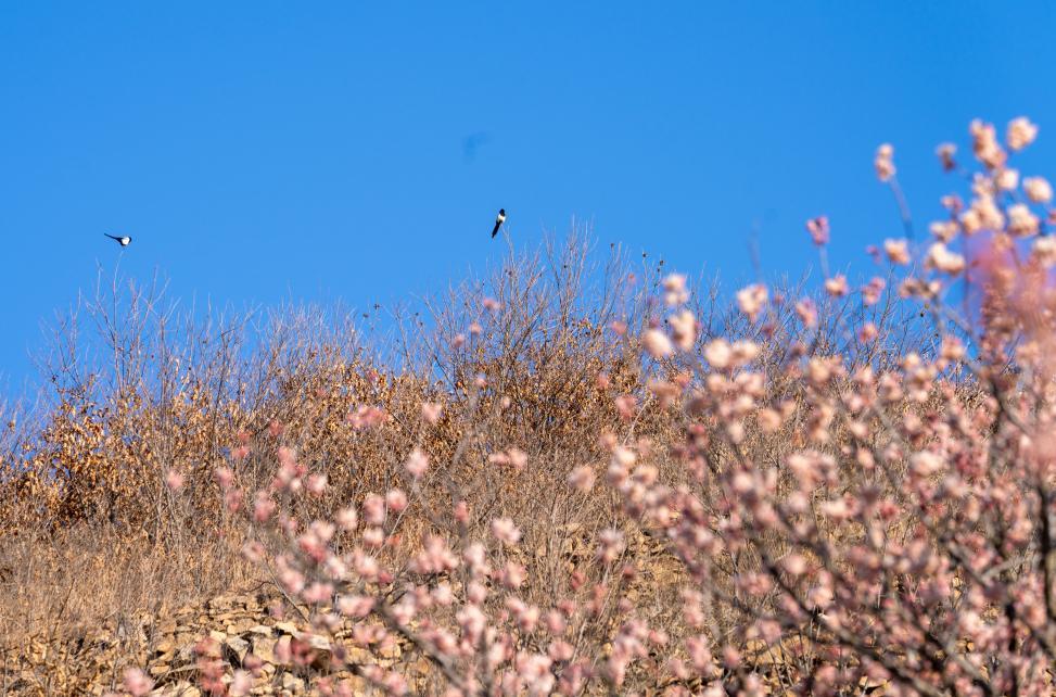 蓝天为幕,粉花缀枝,春燕振翅掠过。 武爱民 摄