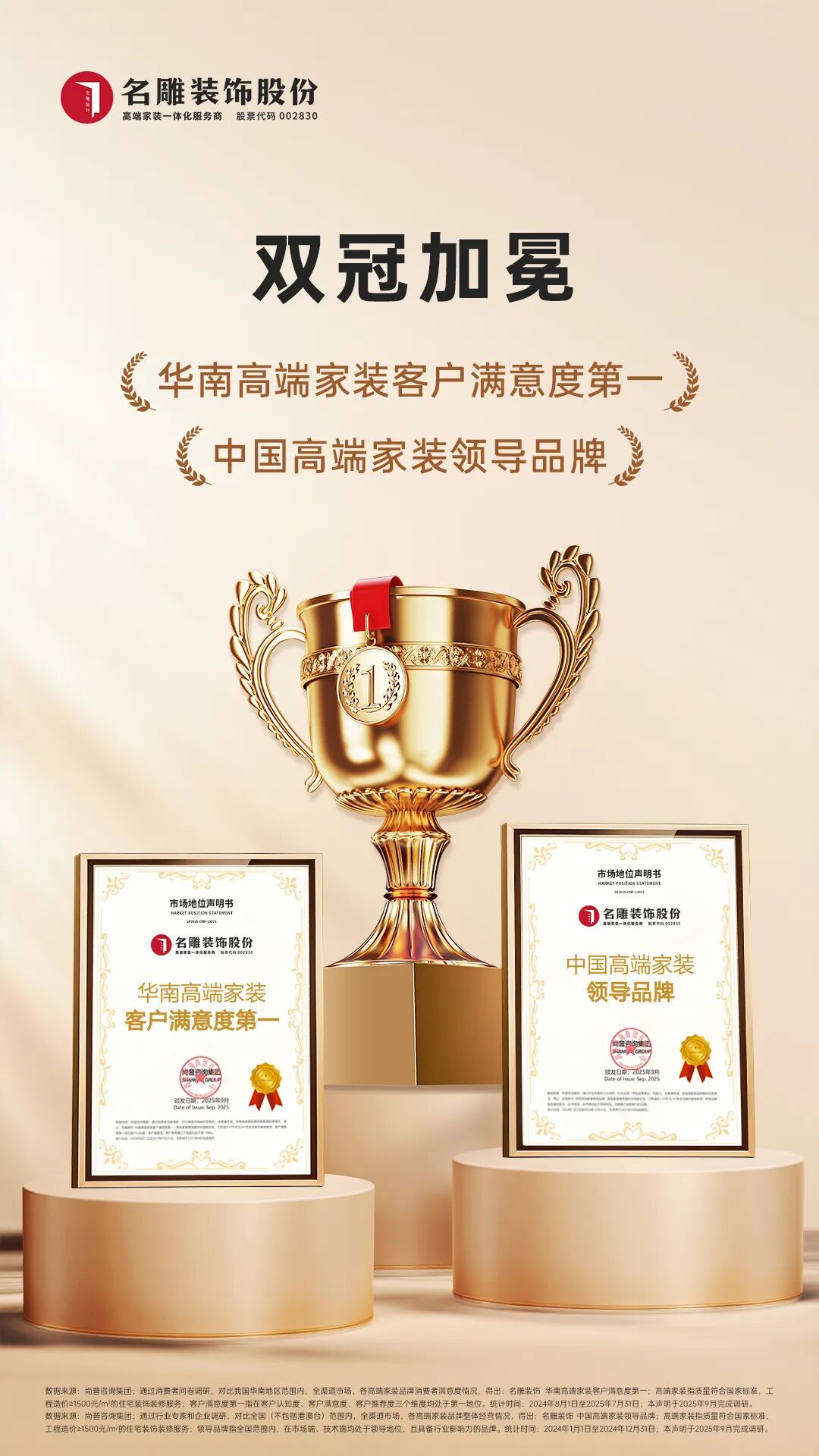 近日,着名阛阓策动机构尚普盘考集团(S&P Consulting)发布巨擘声明,崇敬授予名雕隐敝“中国高端家装开荒品牌[1]”与“华南高端家装客户安逸度第一[2]”两项重磅认证。