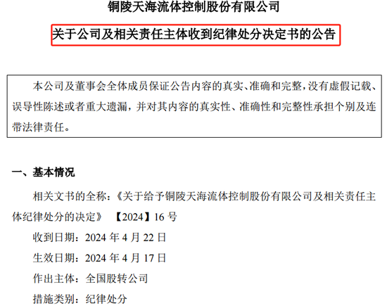 这次安徽证监局的决定书,莫得泄漏中银证券对天海流体控股鼓动、骨子约束东谈主捏股情况核查不充分的细节。但早在本年4月,世界股转公司就对天海流体及关连包袱东谈主进行过表率贬责,并泄漏了罪人违纪笃定。