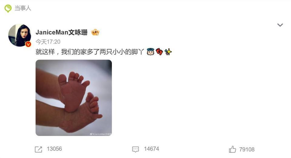 9 月 30 日欧洲杯体育,文咏珊在个东说念主微博蓦地扔出一则“重磅音信”——晒出一张婴儿金莲丫像片,配文“就这么,咱们的家多了两只小小的脚丫”,厚爱官宣升级当妈。这一操作一忽儿引爆热搜,网友纷纷惊呼:“什么时刻结的婚?怎么蓦地就当妈了?”
