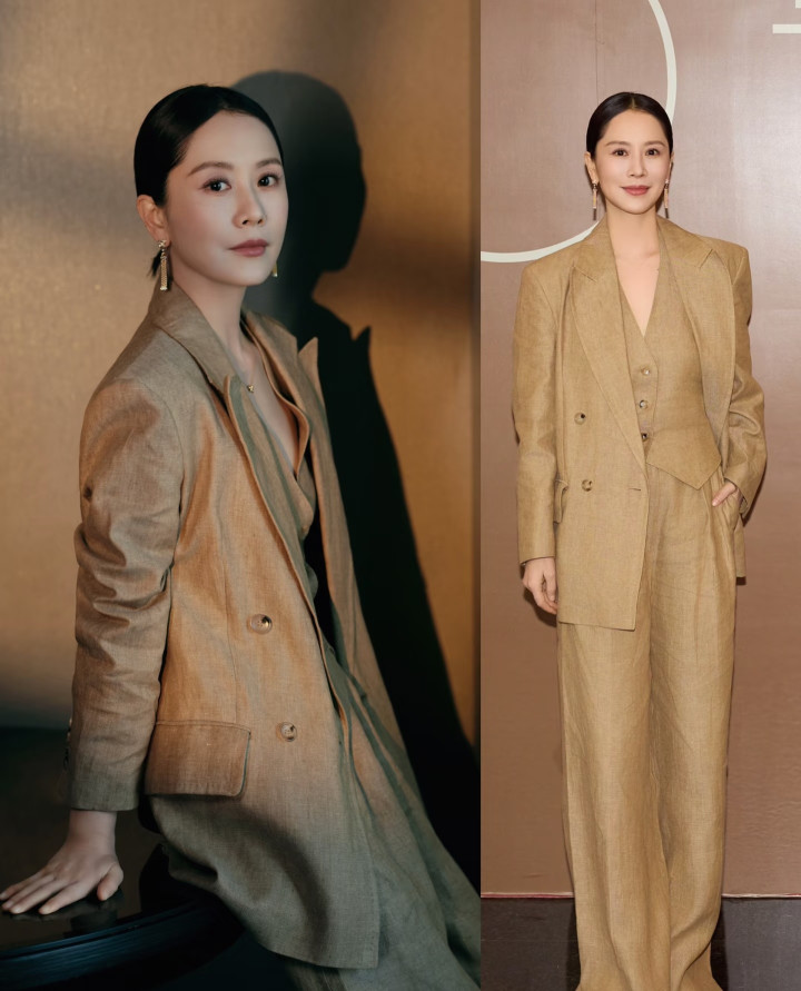 整套的米色西服套装,阔腿裤+垫肩西装,既有做事度又显得很有气场。