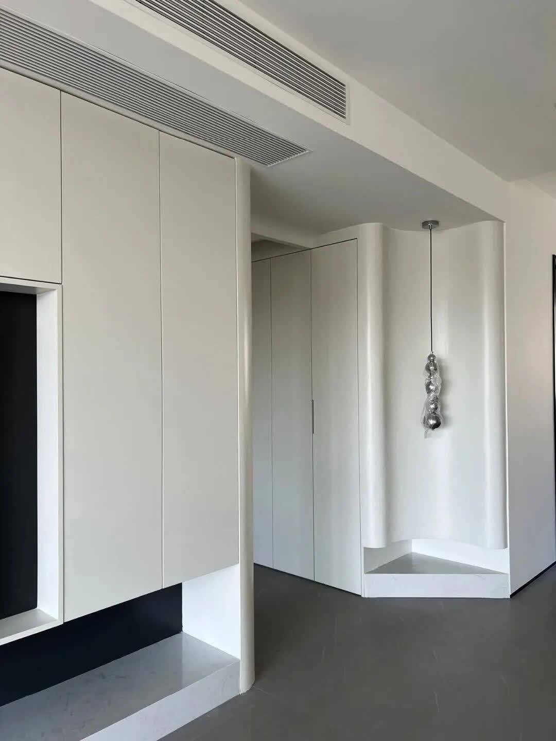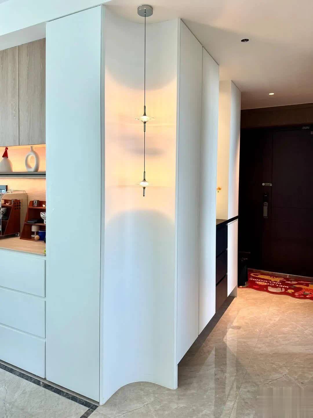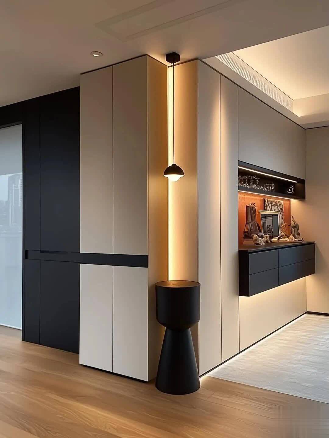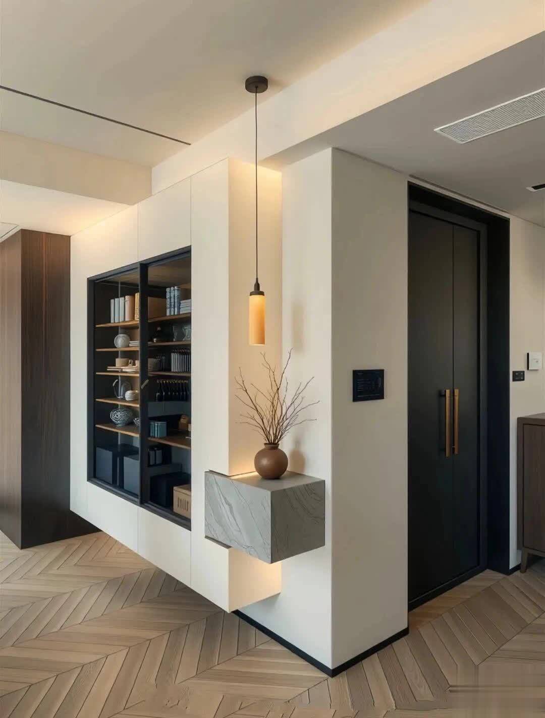 9. 玄关凹墙鞋柜:玄关凹墙定制鞋柜,中间留台面放钥匙,底部留空放常穿鞋,进门整洁有序