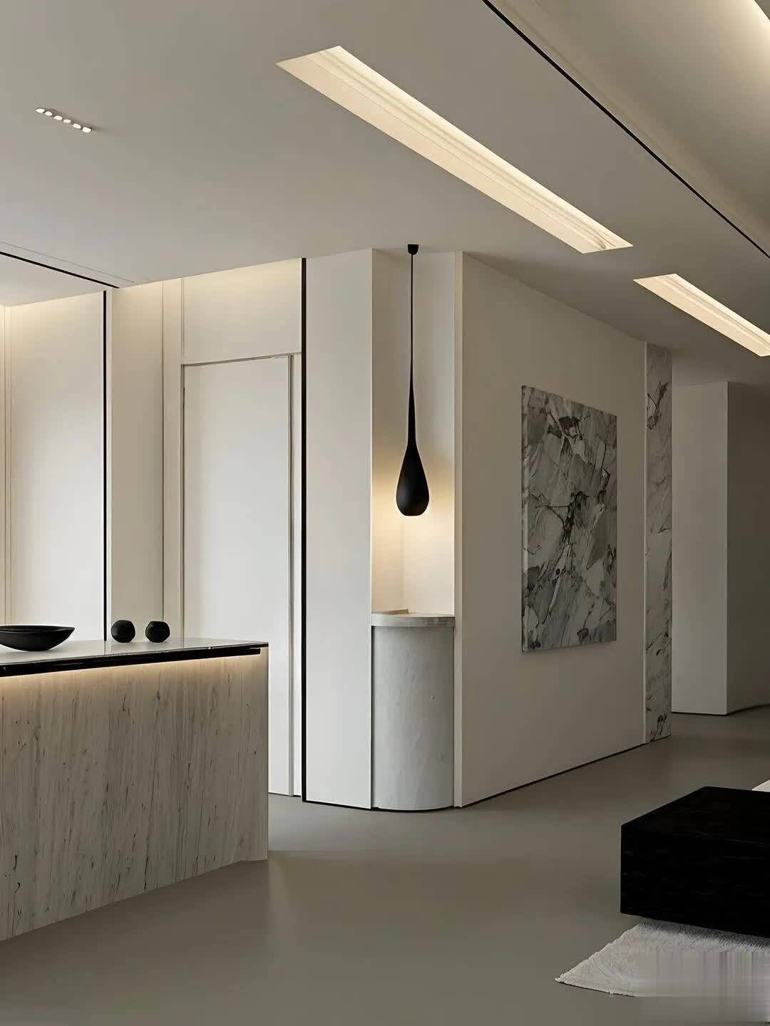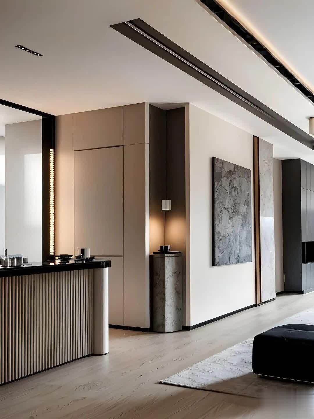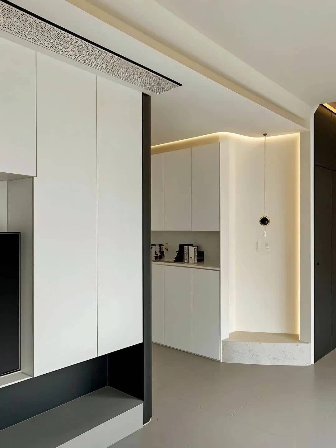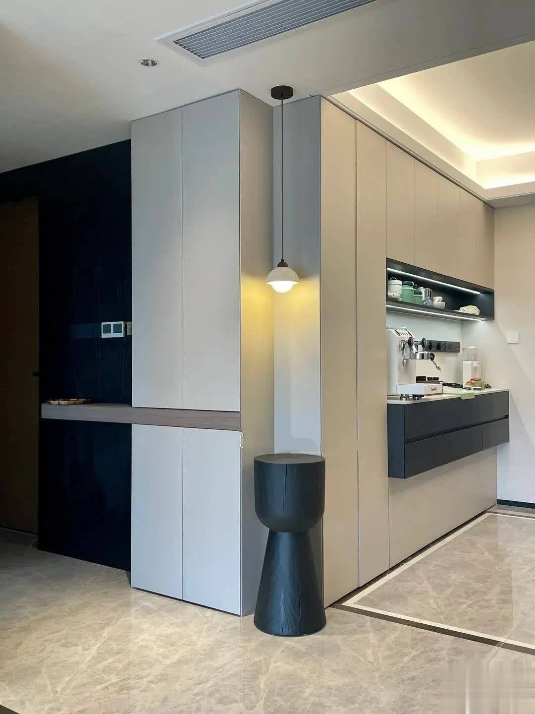 6. 镶嵌式餐边柜:餐厅凹墙作念镶嵌式餐边柜,预留台面放咖啡机、餐具,底部留空放常穿鞋