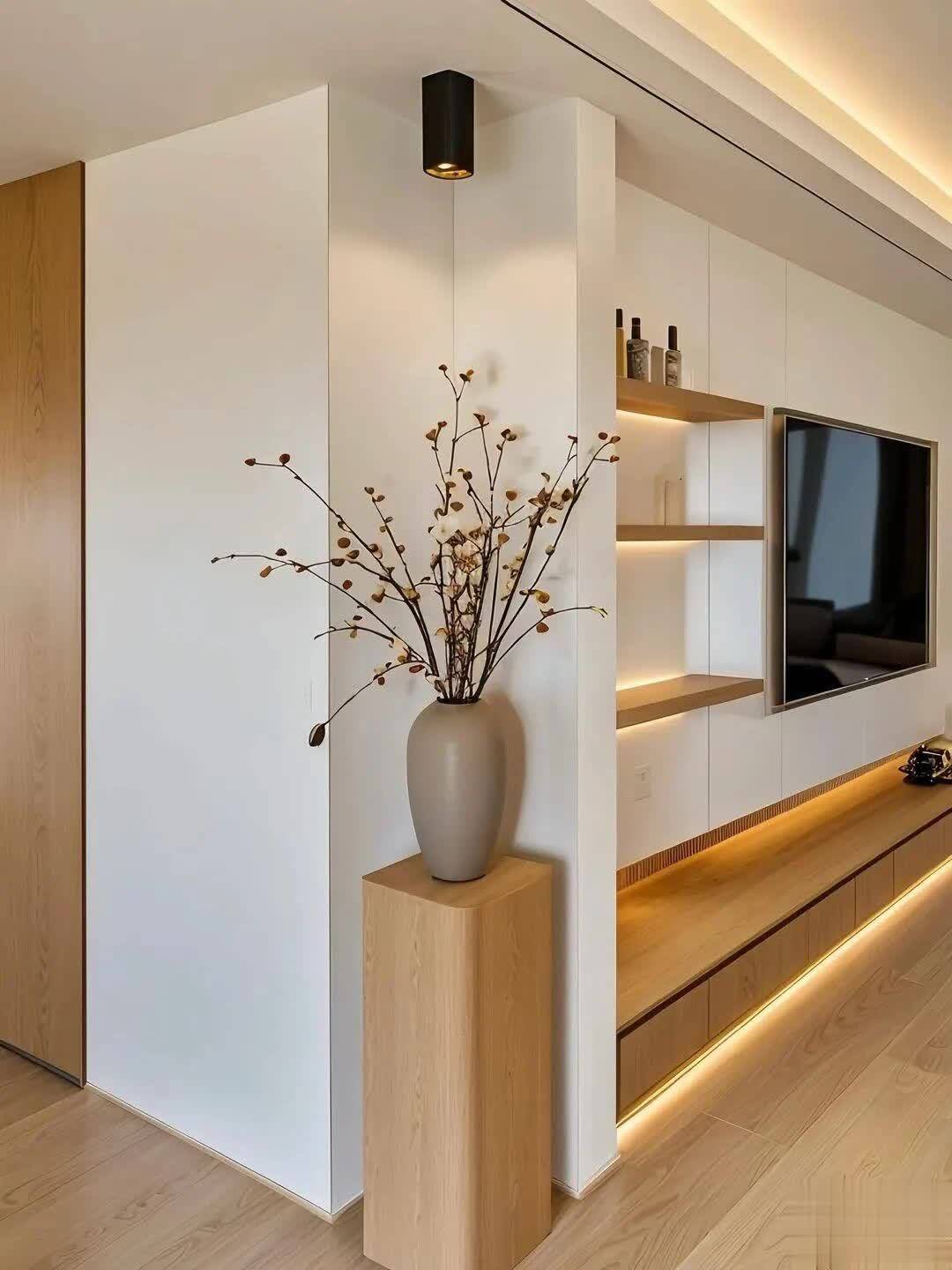 3. 镶嵌式电视柜:凹墙镶嵌定制电视柜,与墙面王人平不占地,搭配悬浮筹算,显空间通透